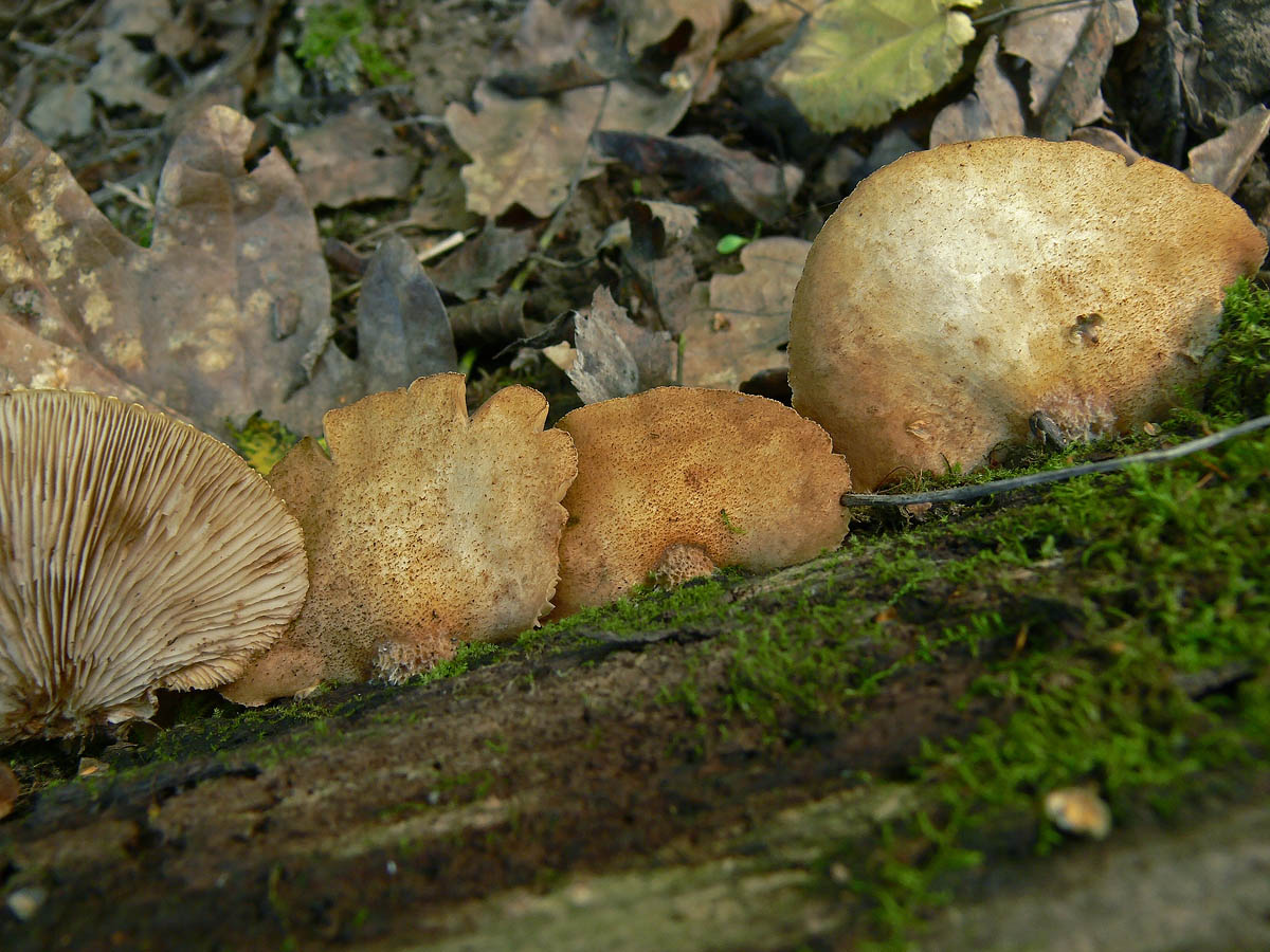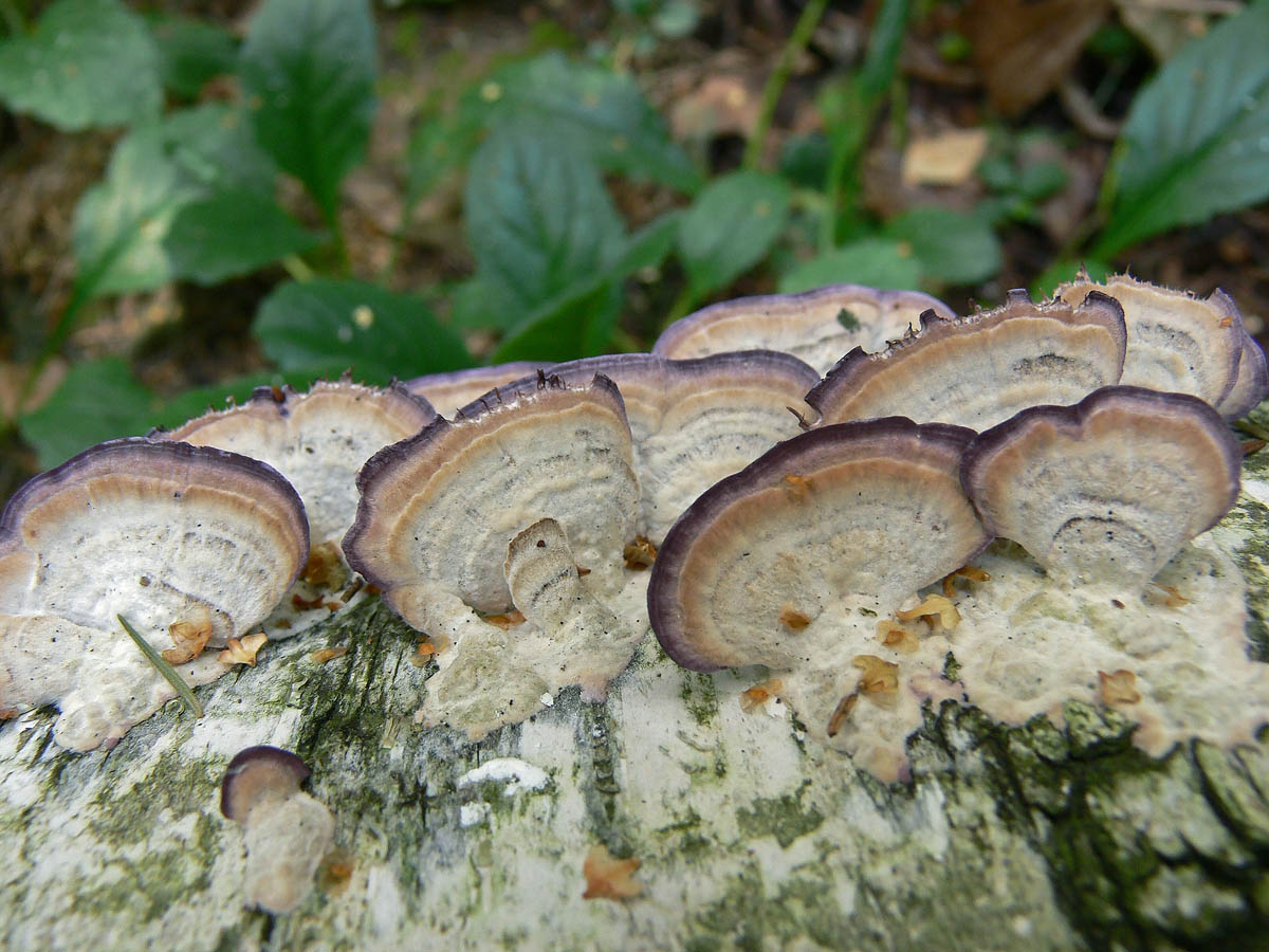 Практически все валежные стволы оккупированы грибами. Здесь и съедобная Вешенка лёгочная (Pleurotus pulmonarius) и совершенно неудобоваримый, зато красивый Дедалеопсис трёхцветный (Daedaleopsis tricolor). Такое количество Дедалеопсиса автор репортажа встречал буквально несколько раз.