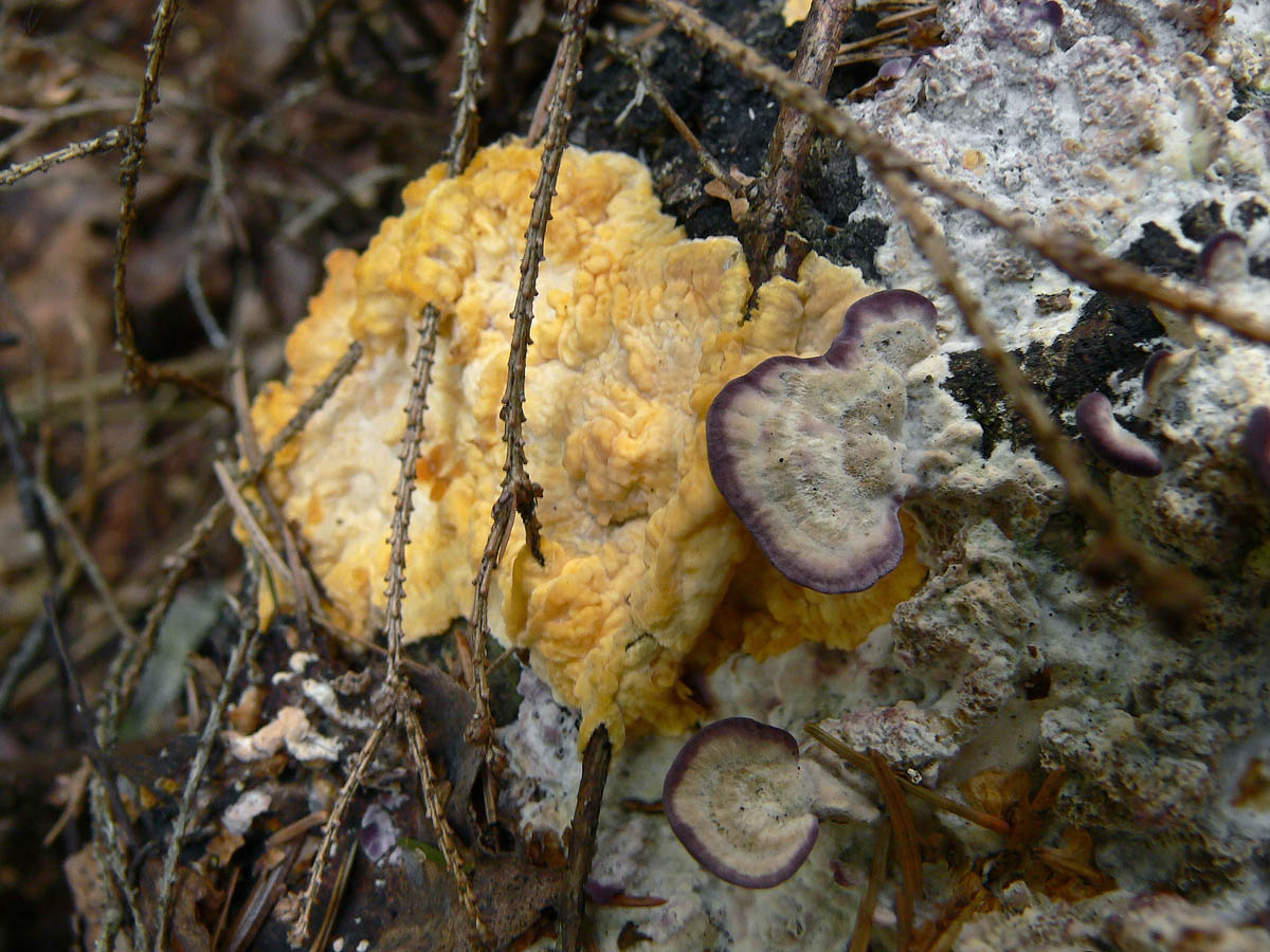 Что это? Неужели двухмесячная засуха привела к развитию хищнических наклонностей у грибов! Флебия красная (Phlebia rufa) с аппетитом пожирает не только окружающие еловые веточки, но и нападает на своего соседа - Трихаптума пергаментного (Trichaptum_biforme).