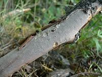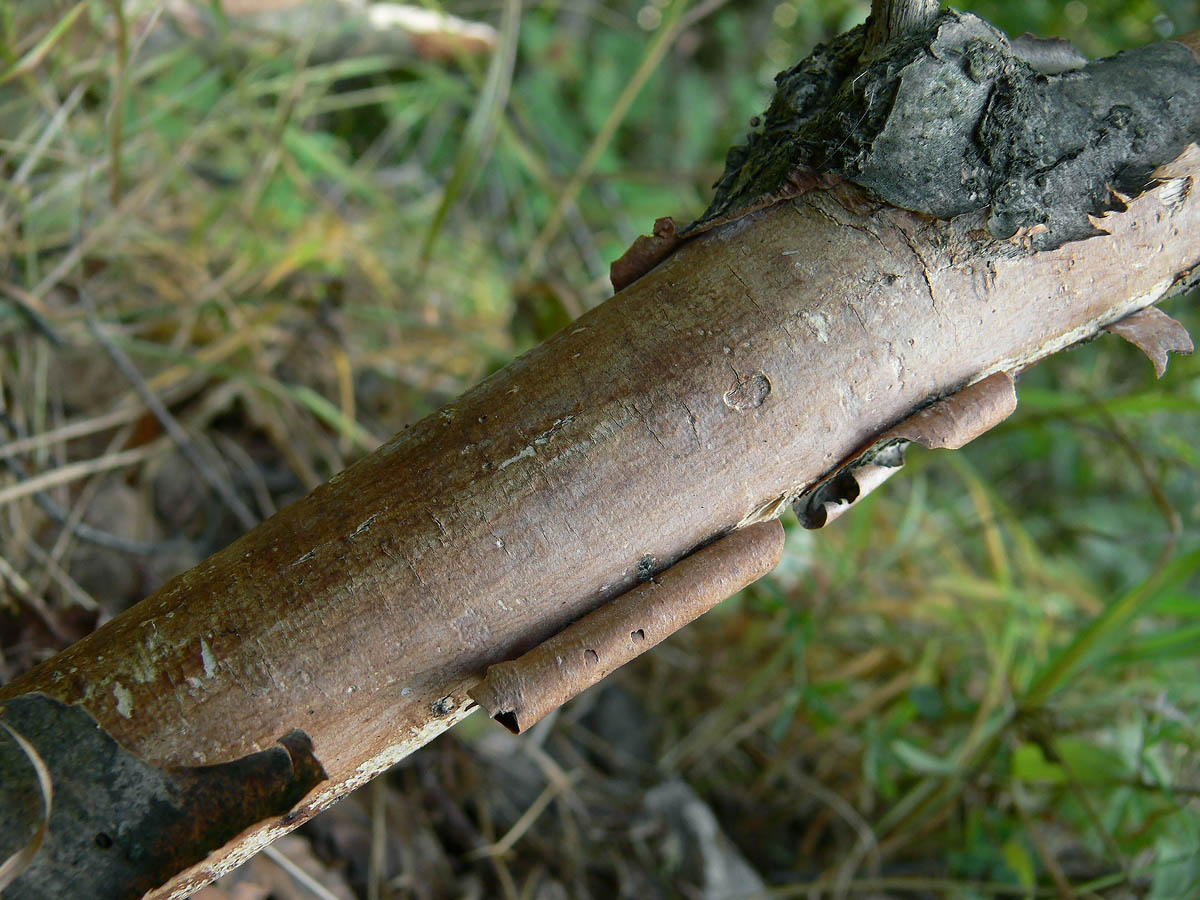 Тихо и незаметно, под слоем коры, делает своё дело Виллеминия орешниковая (Vuilleminia coryli). Только оторвав кору, можно заметить этот гриб.