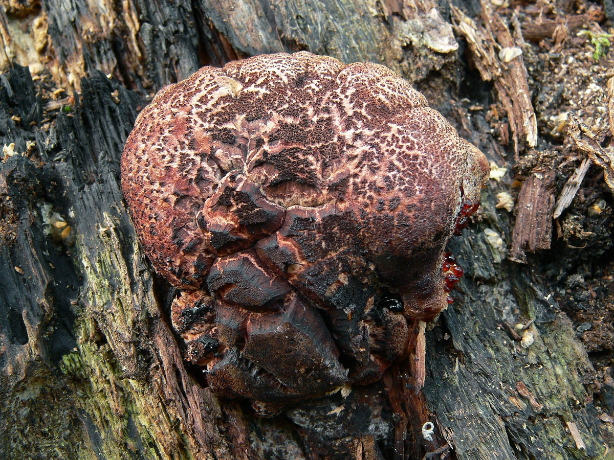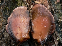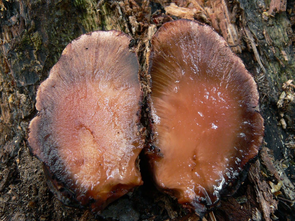Макропризнаки указывают, что гриб похож на замученную жаждой Печёночницу обыкновенную (Fistulina hepatica). Это гуттация карминно-красным соком, и сочная мякоть кисло-солёного вкуса, которая буквально истекала таким же соком. Структура в разрезе - радиально-волокнистая, что свойственно печёночнице.